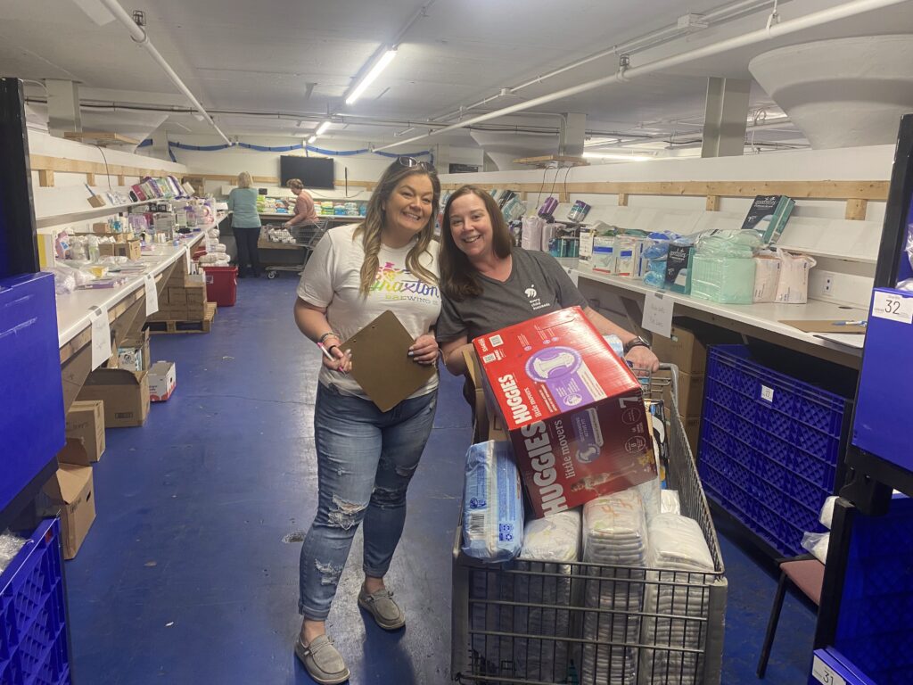 Grab what you need for your clients, and be sure to mark on your sheet the exact quantities of diapers, period supplies, adult supplies, and wipes.